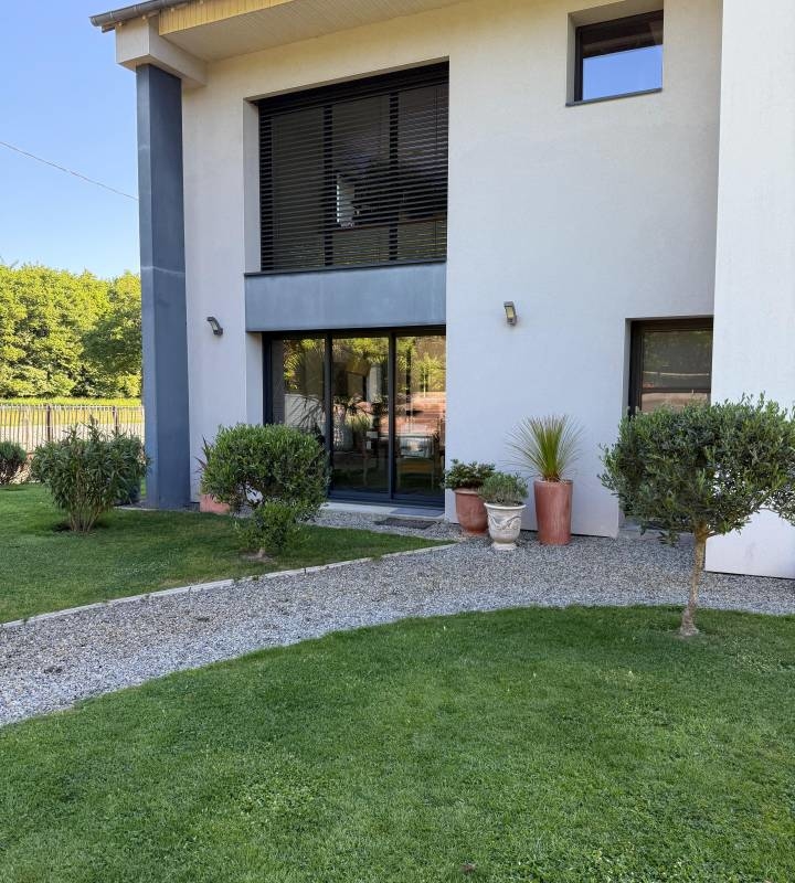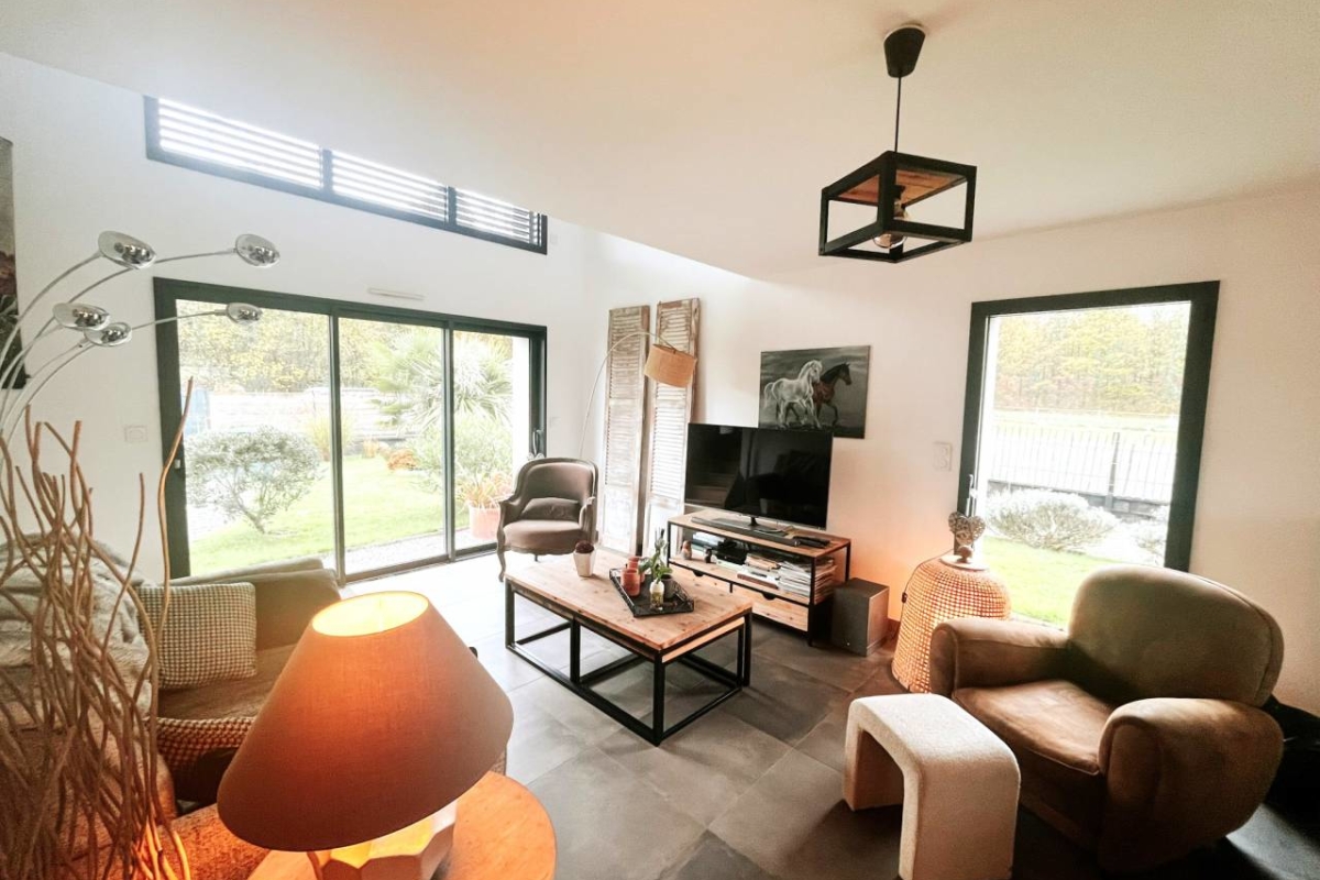 La lumière naturelle inonde le vaste salon-séjour ouvert sur une cuisine moderne entièrement équipée, offrant un espace convivial et chaleureux. Au rez-de-chaussée, vous trouverez également une suite parentale avec dressing et salle d’eau, un sanitaire séparé et une buanderie pratique.