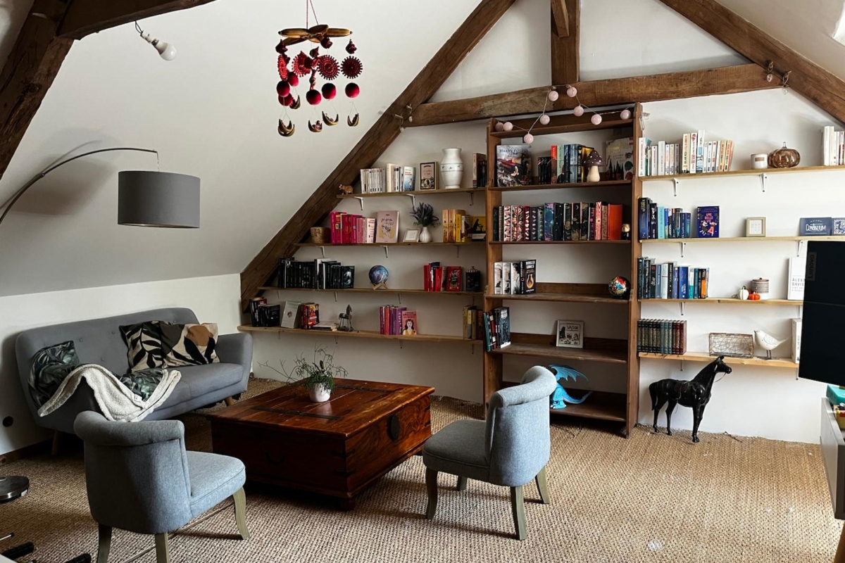 Une mezzanine aménagée avec bibliothèque, idéale pour un espace détente ou lecture